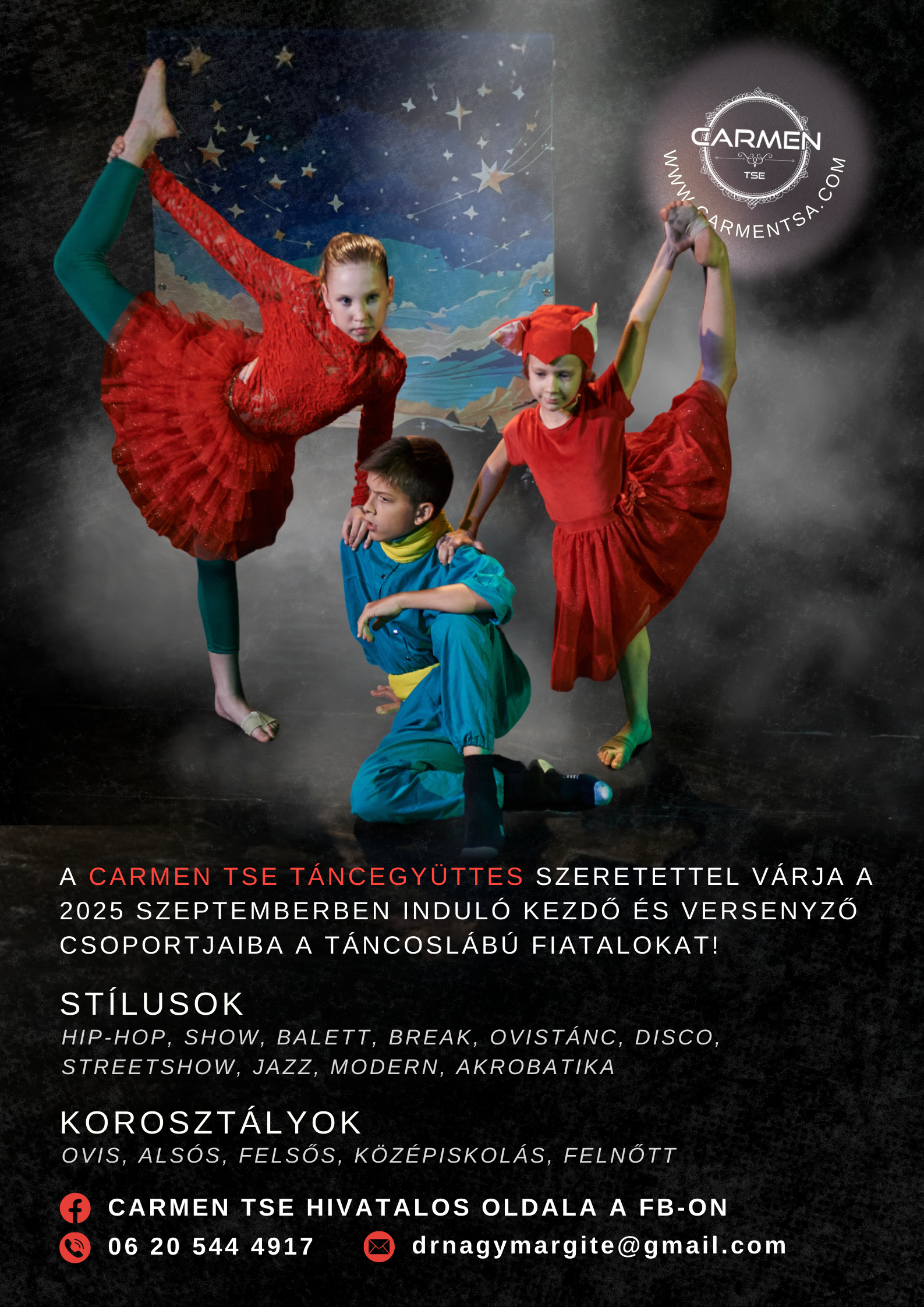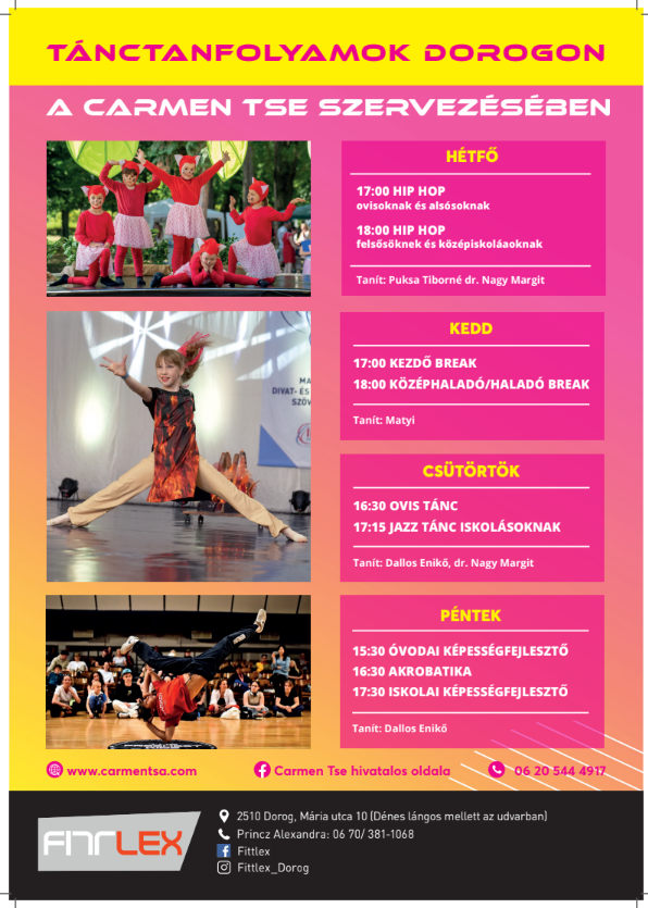 Balett, jazz, modern break, disco, hip-hop, show, fitt dance lady táncórákon vehetnek részt tanulóink alapképzésként, majd különböző modern és divattánc közül választhatnak. Részt vehetnek hobbi szerűen vagy versenyszerűen az órákon. Kiegészítésként akrobatika oktatás is működik tánciskolánkban.